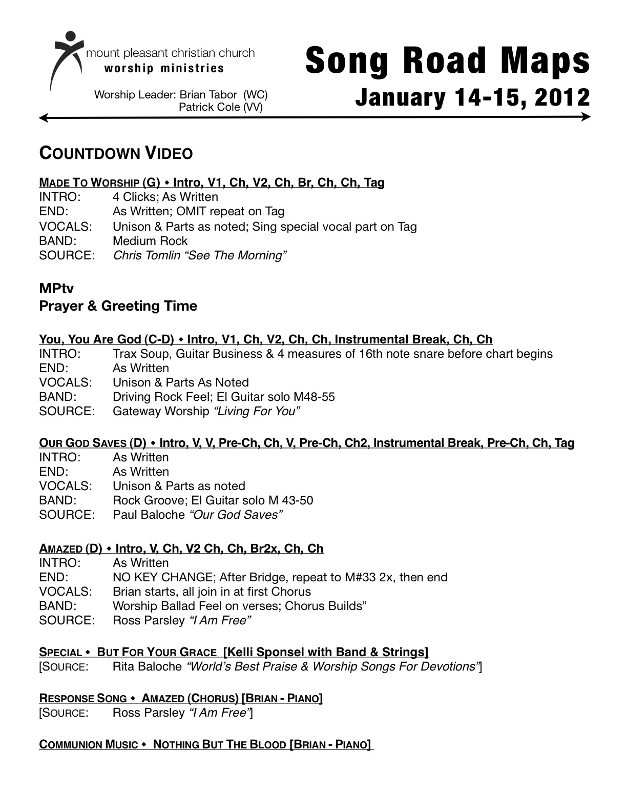 Secondly, we need to have a plan and we need to communicate that plan to our teams. Below you will see a document that we have been working from at MPCC for the last couple of years. We call it a Song Road Map and we do one for every single worship service that takes place around here. The plan is talked about, developed, written out and uploaded to Planning Center Online the week before the service takes place. We also provide music folders for our team each week and they all receive a copy of this Road Map, in addition to the service outline. The expectation is that they are up to speed with this plan when they arrive for rehearsal. It gives them every piece of information about each song and includes notes for our technicians as well.